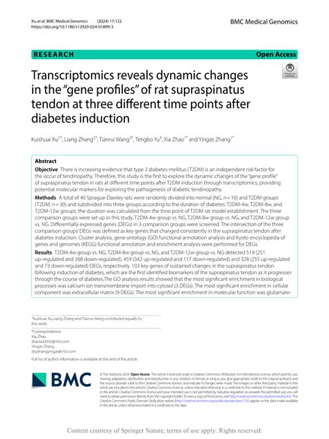 Results: T2DM-4w group vs. NG, T2DM-8w group vs. NG, and T2DM-12w group vs. NG detected 519 (251 up-regulated and 268 down-regulated), 459 (342 up-regulated and 117 down-regulated) and 328 (255 up-regulated and 73 down-regulated) DEGs, respectively. 103 key genes of sustained changes in the supraspinatus tendon following induction of diabetes, which are the first identified biomarkers of the supraspinatus tendon as it progresses through the course of diabetes.The GO analysis results showed that the most significant enrichment in biological processes was calcium ion transmembrane import into cytosol (3 DEGs). The most significant enrichme nt in cellular component was extracellular matrix (9 DEGs). The most significant enrichment in molecular function was glutamate-gated calcium ion channel activity (3 DEGs). The results of KEGG pathway enrichment analysis showed that there were 17 major pathways (p < 0.05) that diabetes affected supratinusculus tendinopathy, including cAMP signaling pathway and Calcium signaling pathway. Conclusions: Transcriptomics reveals dynamic changes in the"gene profiles"of rat supraspinatus tendon at three different time points after diabetes induction. The 103 DEGs identified in this study may provide potential molecular markers for exploring the pathogenesis of diabetic tendinopathy, and the 17 major pathways enriched in KEGG may provide new ideas for exploring the pathogenesis of diabetic tendinopathy. © The Author(s) 2024.